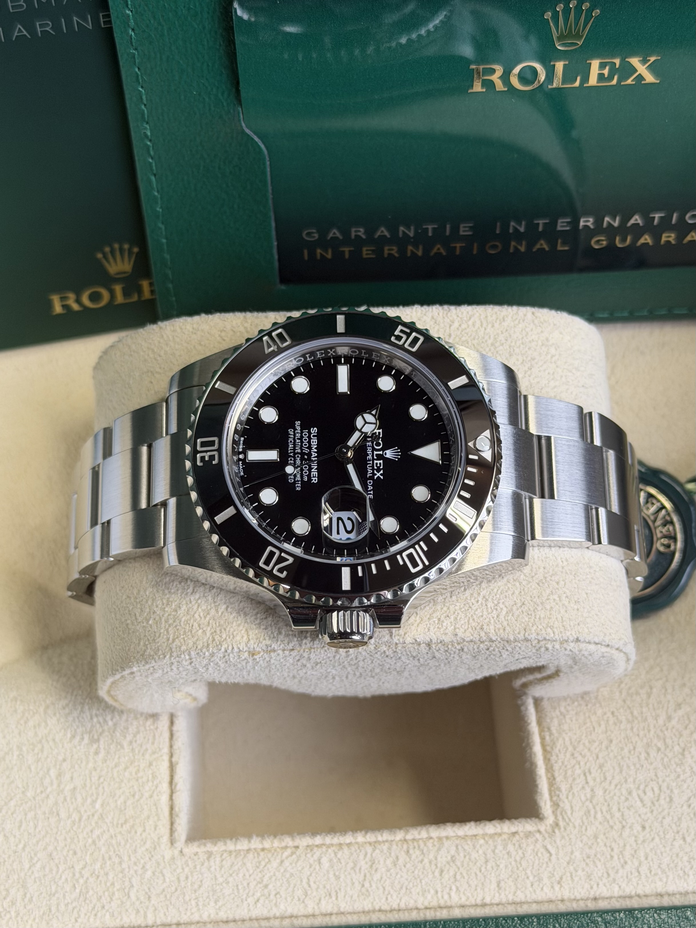 Deze Rolex Submariner Date ref. 126610LN uit 2023 is een ultieme klassieker in perfecte staat, volledig ongedragenen geleverd als full set met originele doos, papieren en garantiekaart. De 41 mm Oystersteel kast met zwarte Cerachrom bezel en zwarte wijzerplaat vormt het tijdloze Submariner-silhouet dat generaties lang symbool staat voor robuustheid én stijl.