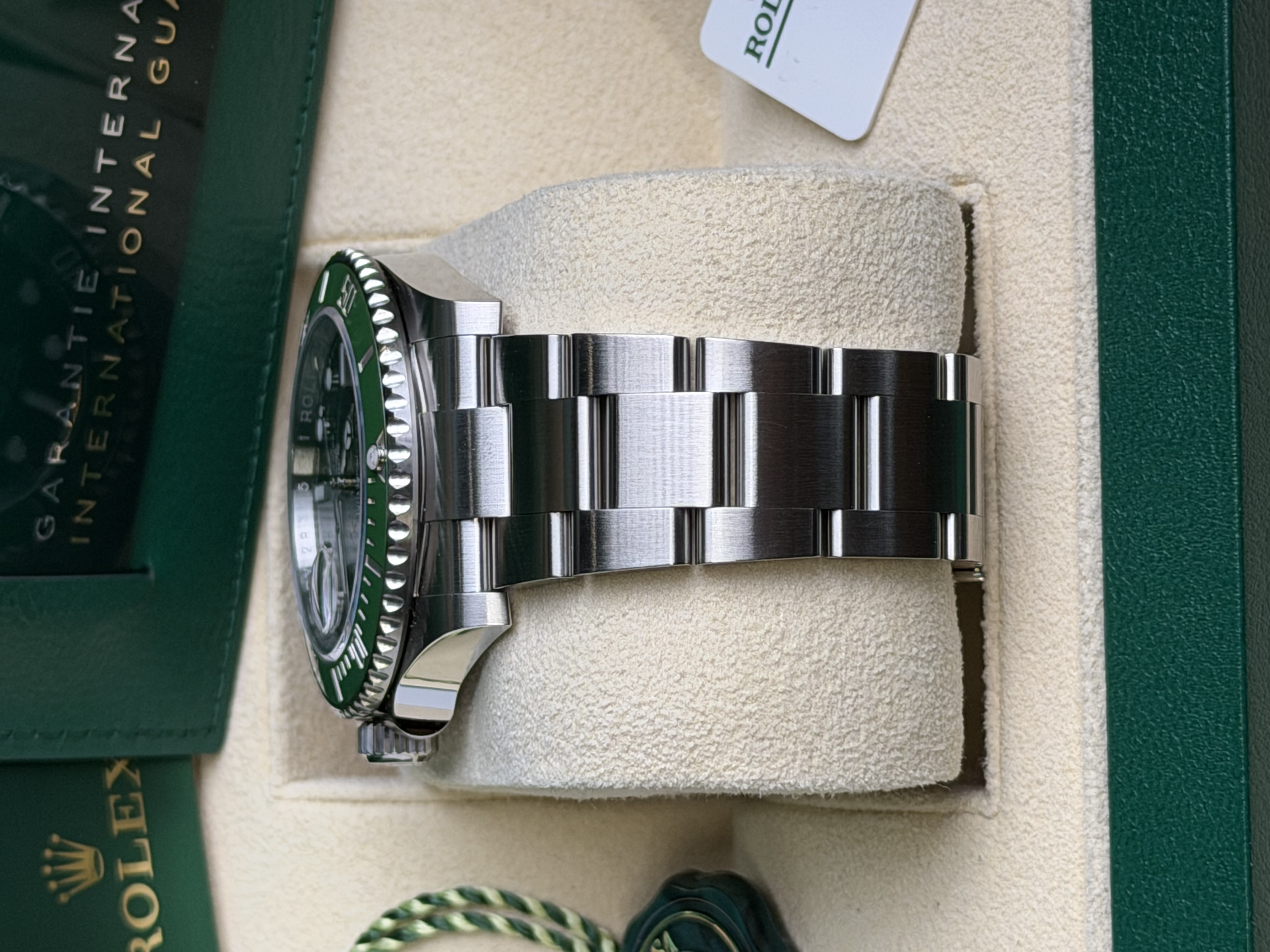 een Rolex Submariner Date 126610LV MK2 uit 2023, volledig unworn en in nieuwstaat met doos en papieren. Deze iconische sport- en duikklassieker heeft een 41 mm Oystersteel-kast, zwarte wijzerplaat en kenmerkende groene Cerachrom-bezel in de MK2-kleurstelling – een frisse, moderne tint groen met subtiel vintage allure. Aangedreven door het robuuste Rolex Calibre 3235 met ca. 70 uur gangreserve en uitgerust met de glidelock-Oyster-bracelet. Tijdloos, prestigieus en een must-have voor iedere verzamelaar.