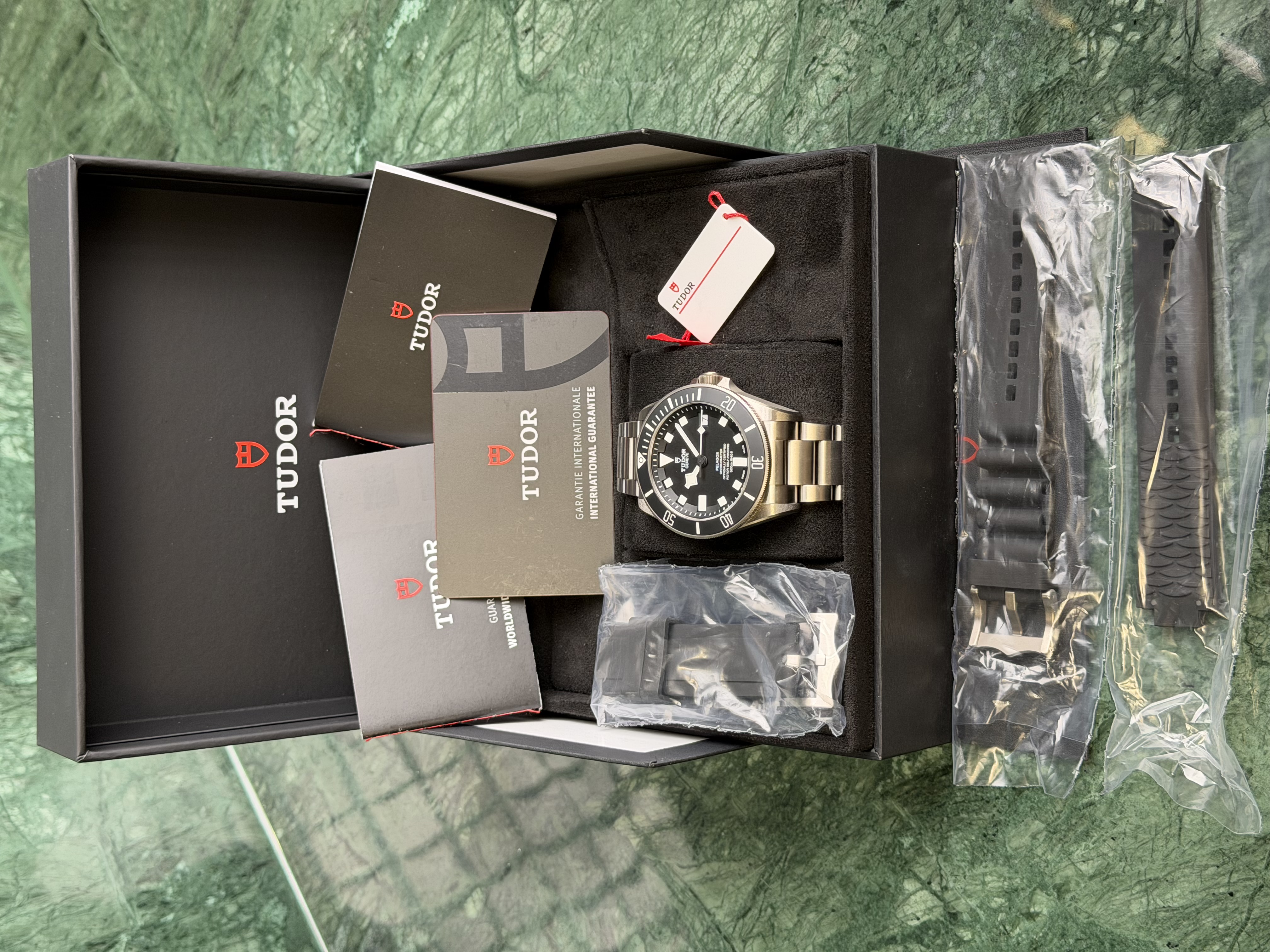 Aangeboden: een Tudor Pelagos 25600TN uit 2025, volledig unworn en in nieuwstaat. Deze professionele duikhorloge is uitgevoerd in lichtgewicht titanium en voorzien van een matte zwarte wijzerplaat met iconische snowflake-wijzers. Aangedreven door het COSC-gecertificeerde Tudor Manufacture uurwerk MT5612 met circa 70 uur gangreserve. Waterdicht tot 500 meter, uitgerust met heliumventiel en zelfverstellende titanium sluiting. Een pure toolwatch met tijdloos design en topklasse techniek.