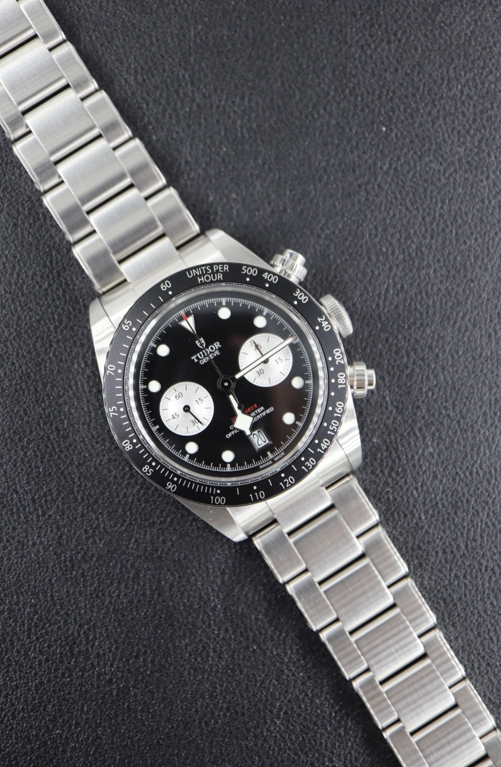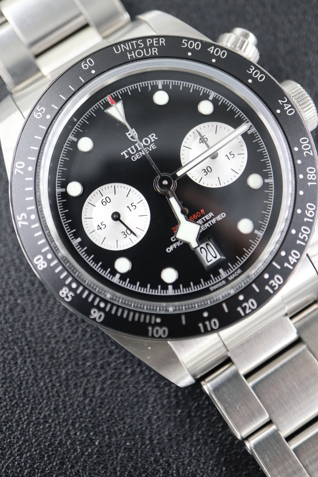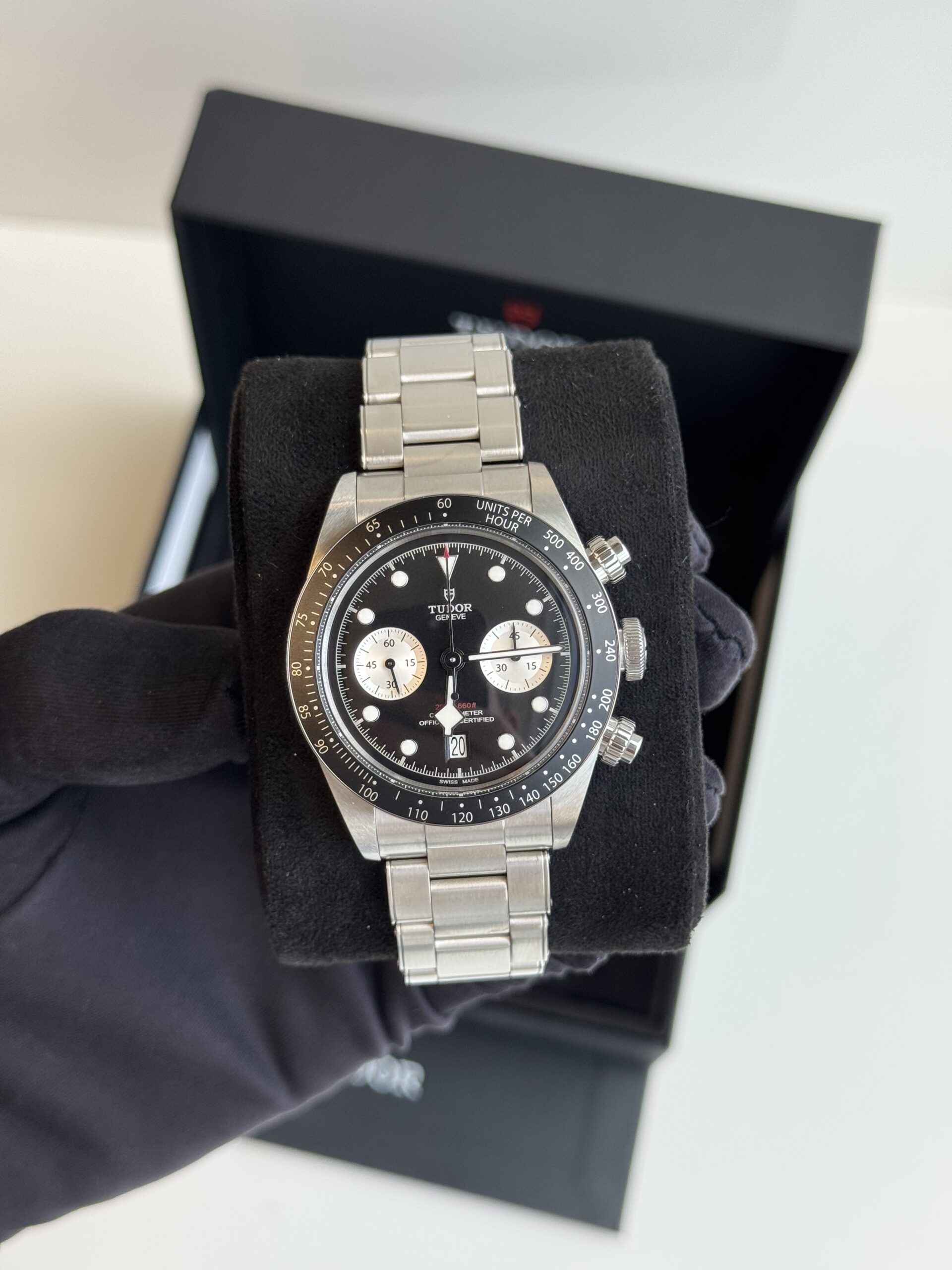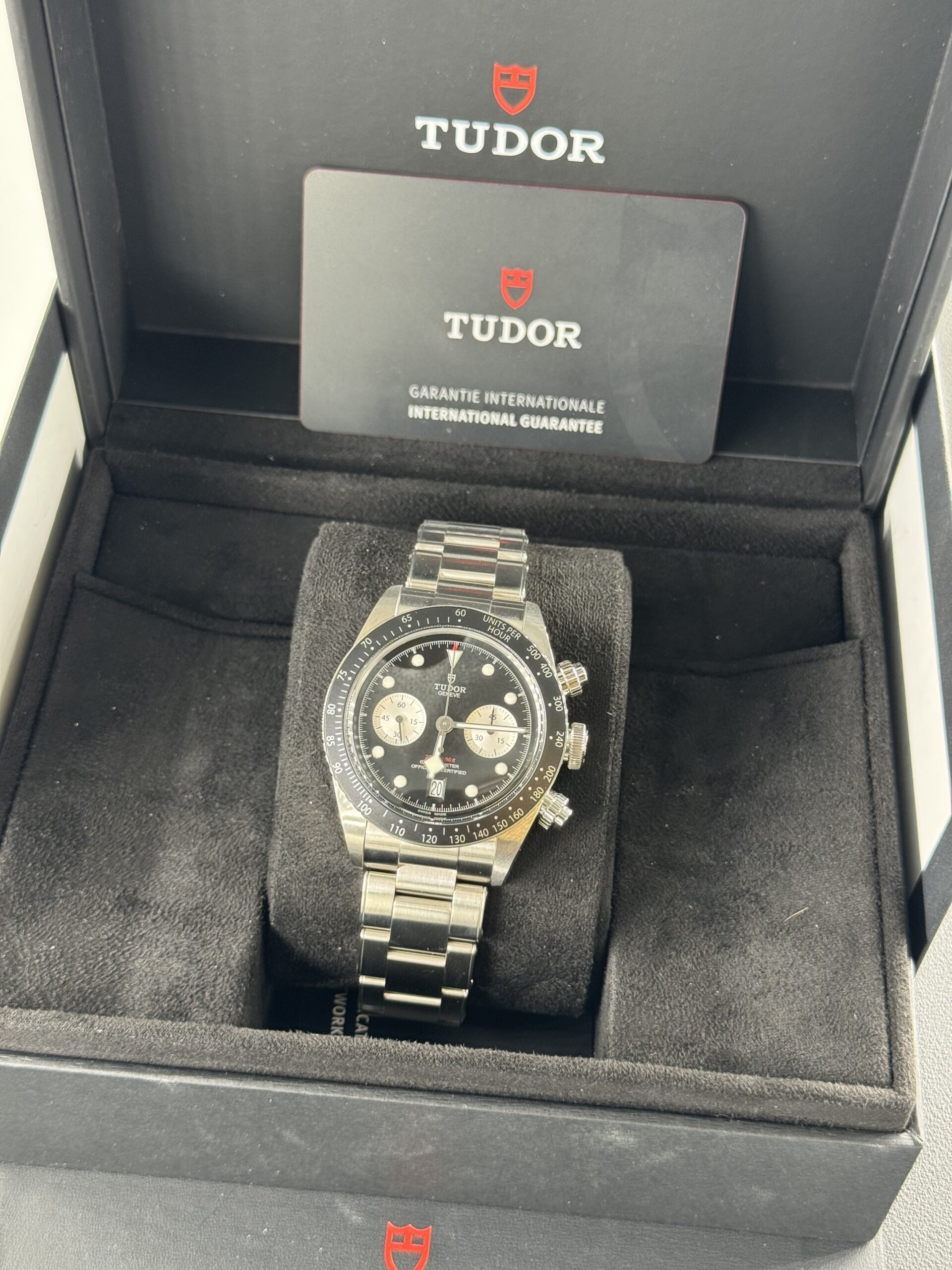 Deze ongedragen Tudor Black Bay Chrono black Watch 79360N wordt geleverd met papieren en de doos van de fabrikant.