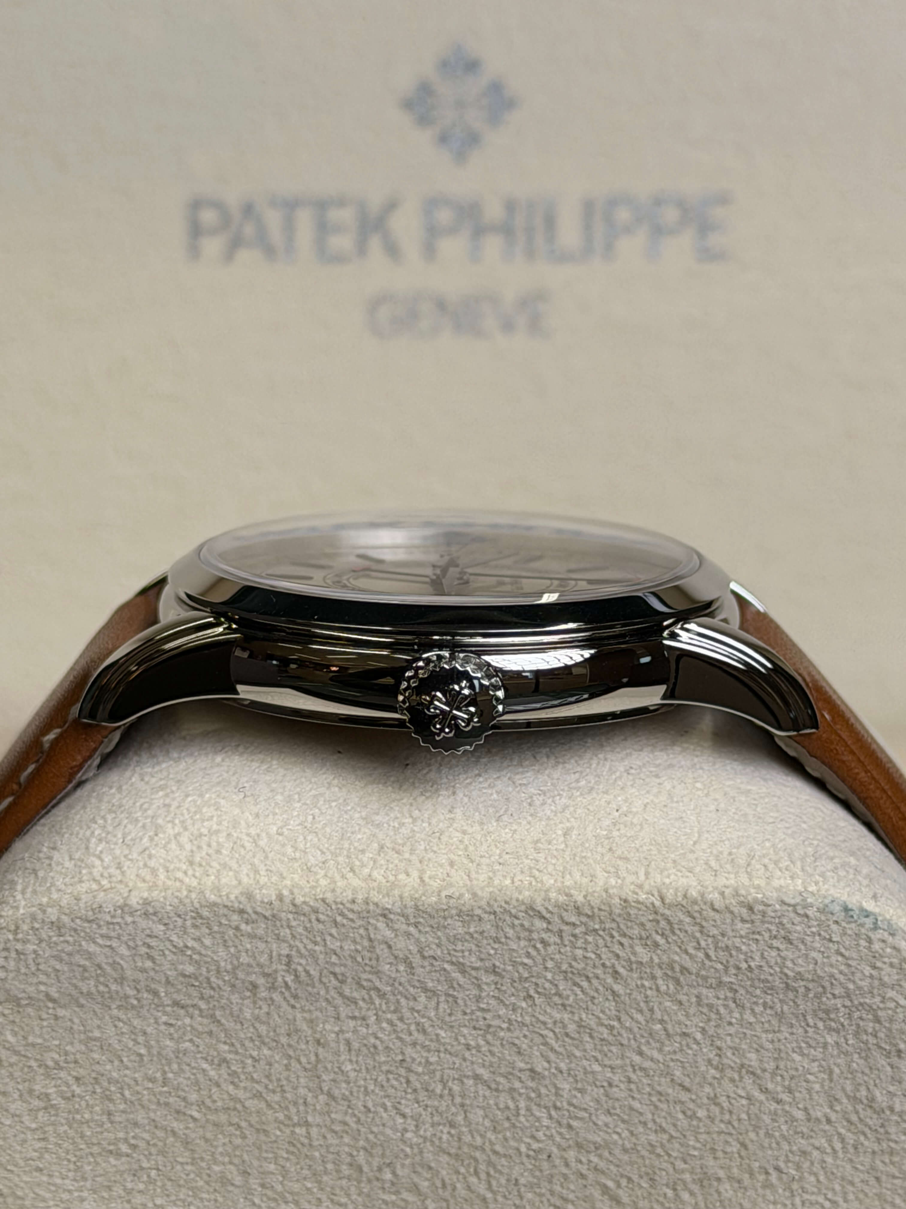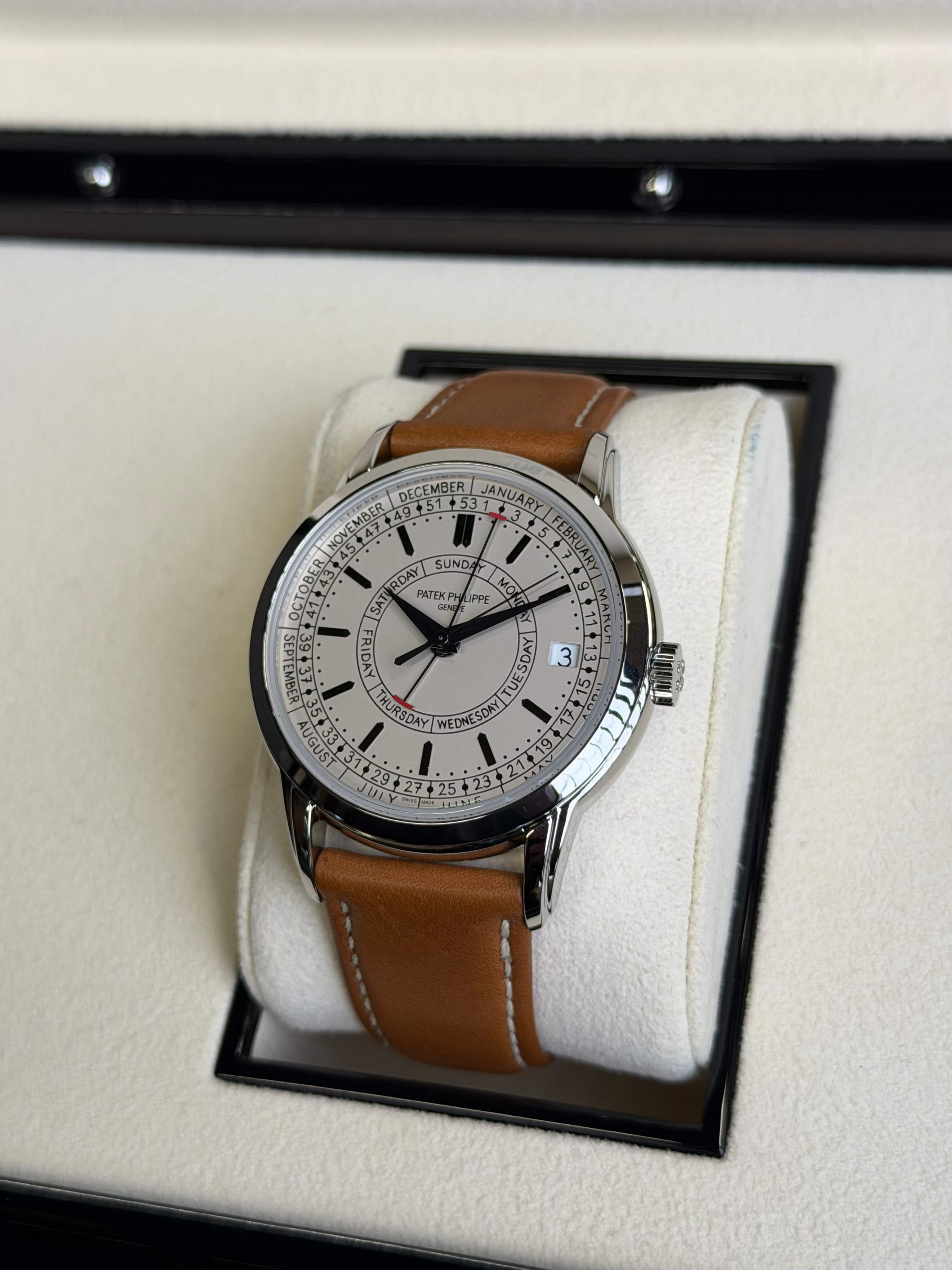 De 40 mm roestvrijstalen kast geeft deze Calatrava een frisse, hedendaagse uitstraling. Wat dit model echt bijzonder maakt is de unieke wijzerplaat met handschrift-stijl typografie, waarop niet alleen de datum maar ook de weeknummers en de dag van de week worden weergegeven. Een zeldzame en uiterst praktische complicatie die elegant en overzichtelijk is geïntegreerd.
