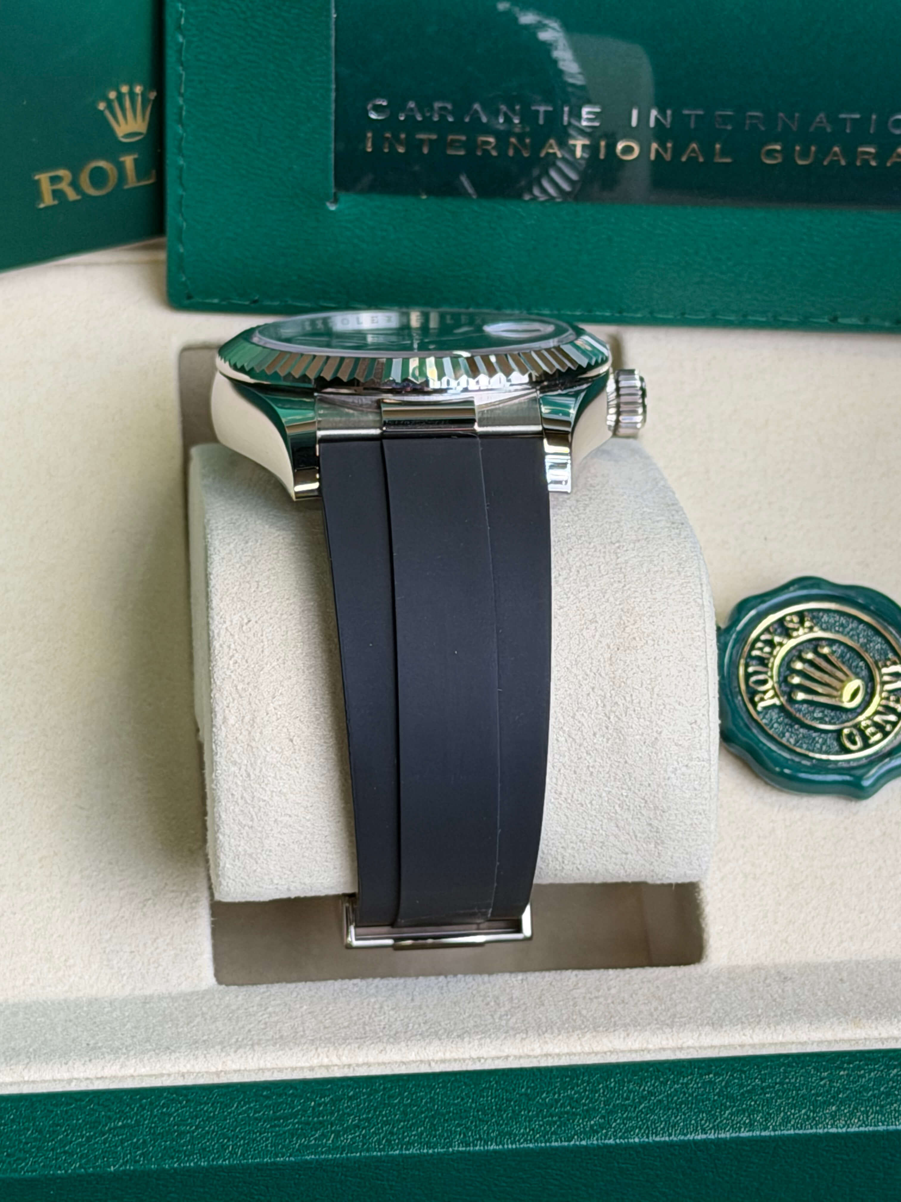 Het horloge is uitgevoerd op de sportieve en comfortabele Oysterflex band, die de elegantie van edelmetaal combineert met het draagcomfort en de flexibiliteit van elastomeer. De band is voorzien van een 18 kt witgouden Oysterclasp, wat zorgt voor een perfecte balans tussen luxe en functionaliteit.